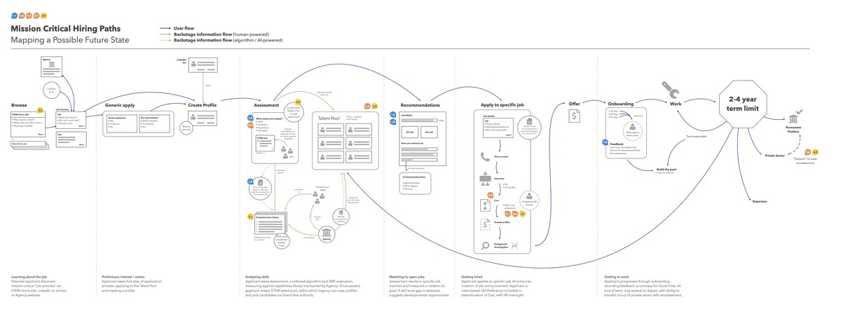 A simple glance at the diagram above shows that the system of hiring is complex and involves multiple groups and stakeholders. The USAJobs team created an illustration of the hiring path components: people, stages, and touchpoints. Through this diagram, the team was able to explore the system of hiring, and that exploration resulted in greater understanding. The diagram clarifies nuances in the system to viewers, and communicates ideas for the systems’ many possible throughlines and values in a concise yet thorough manner. This understanding then informed the development of the USAJobs site product in terms of the various stakeholders’ positions and needs in the system.